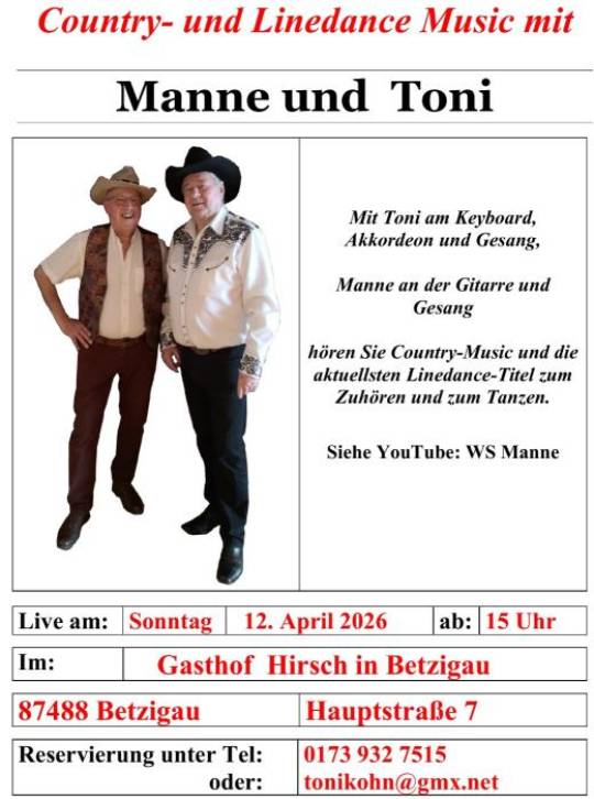 Reservierung bei Toni Kohn per Tel. oder WhatsApp